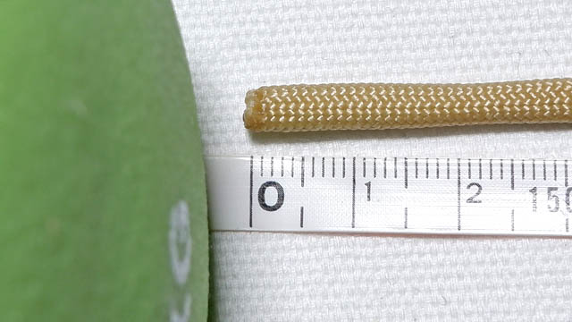 画面上下(縦にすると左右)に編み込み用の紐がありますが、この紐の長さを測れば、取り付け(軸)にどれだけパラコードを使ったかが分かります。