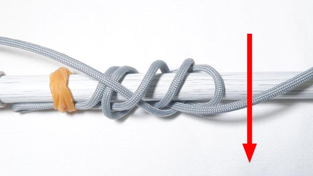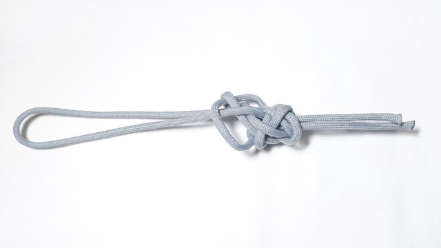 左の輪の部分と、右側の2本の先端の紐を掴んで 引っ張って軽く引き締めます。