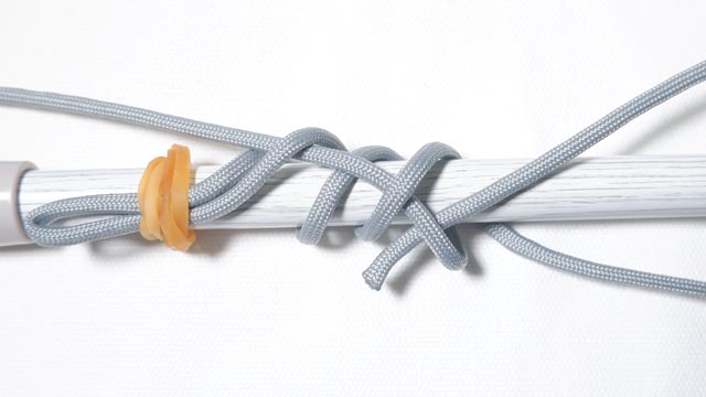 これで、2回巻き付けられました。(巻き付けた2本の紐は、交差したり ねじれたりしないように注意して巻き付けましょう)